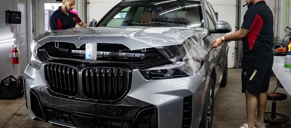 Two men applying protective film to the hood of a silver BMW SUV inside a garage.